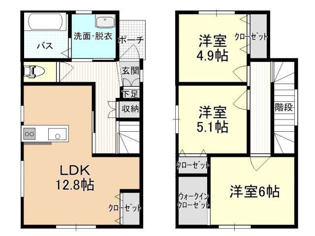 | 詳細間取 | 3LDK (2階:洋6帖×1、2階:洋5.1帖×1、2階:洋4.9帖×1、1階:LDK12.8帖) | ||