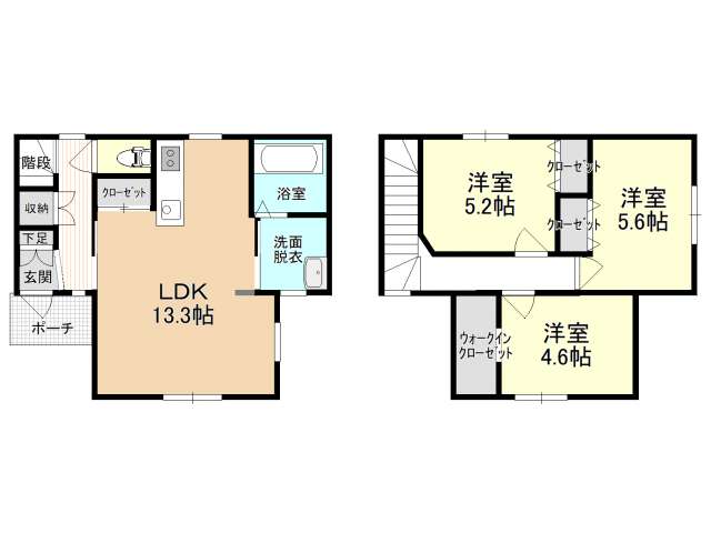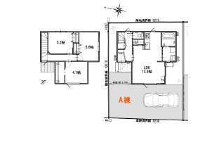 | 詳細間取 | 3LDK (2階:洋5.6帖×1、2階:洋5.2帖×1、2階:洋4.7帖×1、1階:LDK13.3帖) | ||