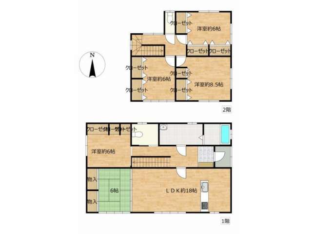 | 詳細間取 | 5LDK (1階:和6帖×1、1階:洋6帖×1、2階:洋8.5帖×1、2階:洋6帖×2、1階:LDK18帖) | ||