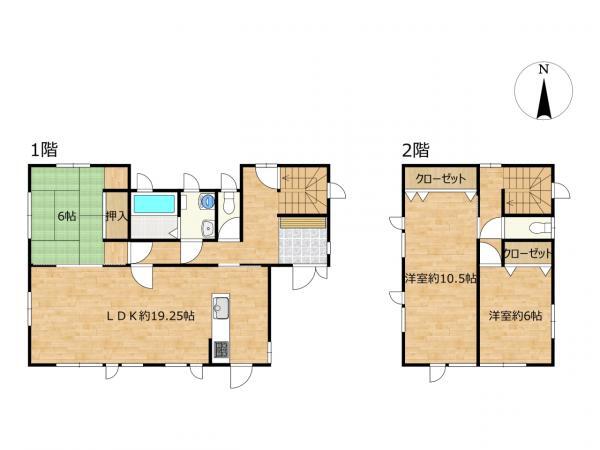 | 詳細間取 | 3LDK (1階:和6帖×1、2階:洋10.5帖×1、2階:洋6帖×1、1階:LDK19.25帖) | ||