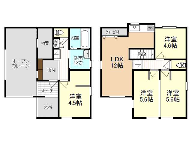 | 詳細間取 | 4LDK (1階:洋4.5帖×1、2階:洋5.6帖×2、2階:洋4.6帖×1、2階:LDK13帖) | ||