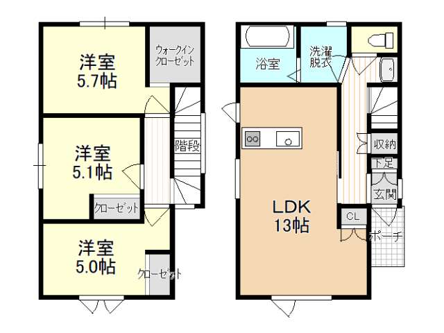 | 詳細間取 | 3LDK (2階:洋5.7帖×1、2階:洋5.1帖×1、2階:洋5帖×1、1階:LDK13帖) | ||