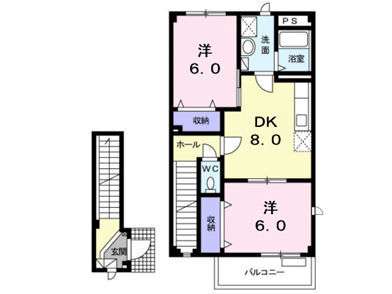 | 詳細間取 | 2DK (洋6帖×2、DK8帖) | ||