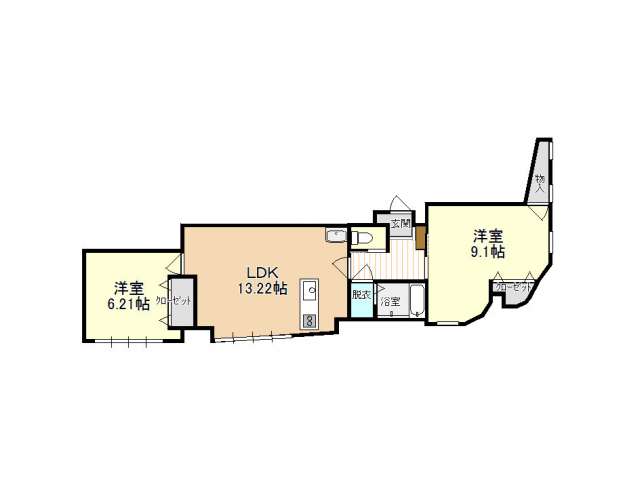 | 詳細間取 | 2LDK (洋9.1帖×1、洋6.21帖×1、LDK13.22帖) | ||