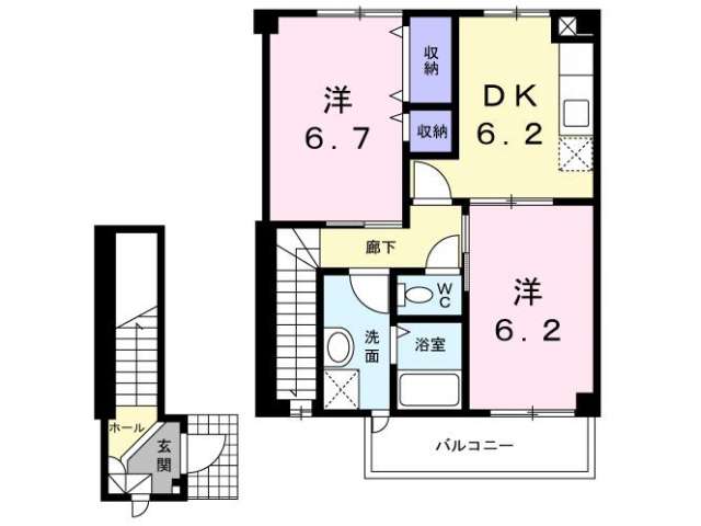 | 詳細間取 | 2DK (洋6.7帖×1、洋6.2帖×1、DK6.2帖) | ||