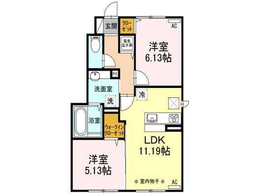 | 詳細間取 | 2LDK (洋5.13帖×1、洋6.13帖×1、LDK11.19帖) | ||
