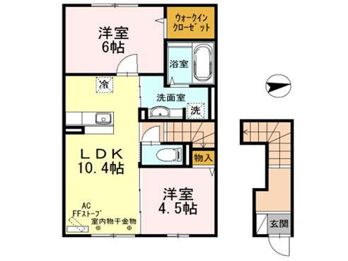 | 詳細間取 | 2LDK (洋6帖×1、洋4.5帖×1、LDK10.4帖) | ||