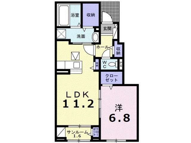 | 詳細間取 | 1LDK (洋6.8帖×1、LDK11.2帖、サンルーム1.6帖) | ||