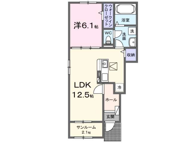 | 詳細間取 | 1LDK (洋6.1帖×1、LDK12.5帖、サンルーム2.1帖) | ||